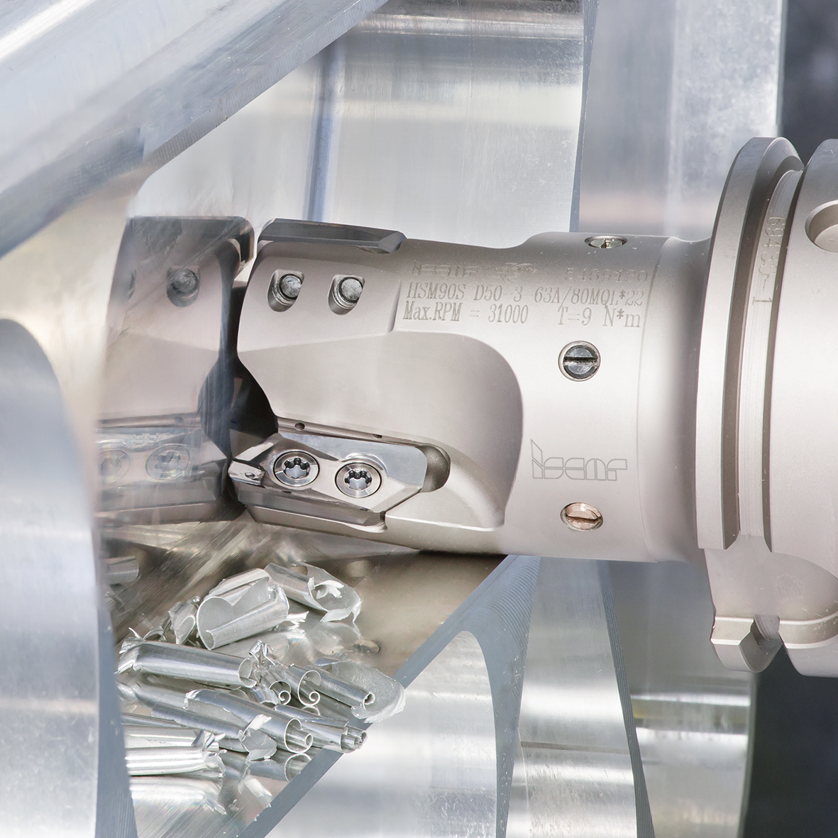 Com a ajuda de máquinas-ferramentas modernas, a fresagem altamente produtiva de ligas de alumínio pode ser alcançada em velocidades de fuso extremamente altas, atingindo até 33000 rpm. Para atender a esse desafio de usinagem, a ISCAR desenvolveu fresas de fresagem intercambiáveis de 90° que acomodam pastilhas de grande tamanho para uma profundidade de corte de até 22 mm (.870") (Fig. 2). As fresas foram especificamente projetadas para eliminar o deslocamento radial da pastilha, que pode ocorrer devido às altas forças centrífugas geradas durante velocidades rotacionais muito altas.